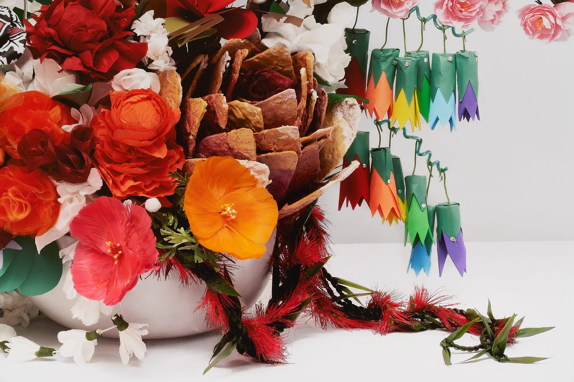 ARTWORK STATEMENT:Winter, 1979, the all-boys Jesuit high school I attended brought me to San Francisco as part of a mini course, studying subcultures within the city. I saw the vibrant shimmering breadth of the communities here and was awakened, seeing my world in an entirely new light. I’d found a place where I fit in, no longer feeling like the odd one out. In 1985, I returned to San Francisco for graduate school and found the multicultural world I saw as a teenager was now mine to live. I identified, recognized my fears, and found inspiration - my own “cosmic dancer” moment. I’ve reveled in this rich, complicated place where many of us come to survive the deluges of oppression/repression/suppression - sometimes experiencing them instead. In manifesting and realizing Bouquet, I asked over 49 organizations, institutions, and individuals to make flowers that represented their cultures and communities. The project was conceived during 2020, so inevitably there were many who never replied to my numerous emails and phone calls—non-profits, community, and cultural organizations staff are stretched thin and working tirelessly during this challenging era. These newly formed relationships taught me about communities and individuals negotiating how to come together in this particular moment in time. This bouquet holds so much more than metaphors and symbols, it holds love, hope, the creative zeitgeist of identifying, making, craft, and beauty. I was able to collaborate with so many extraordinary, wonderful, lovely human beings. This is my contribution