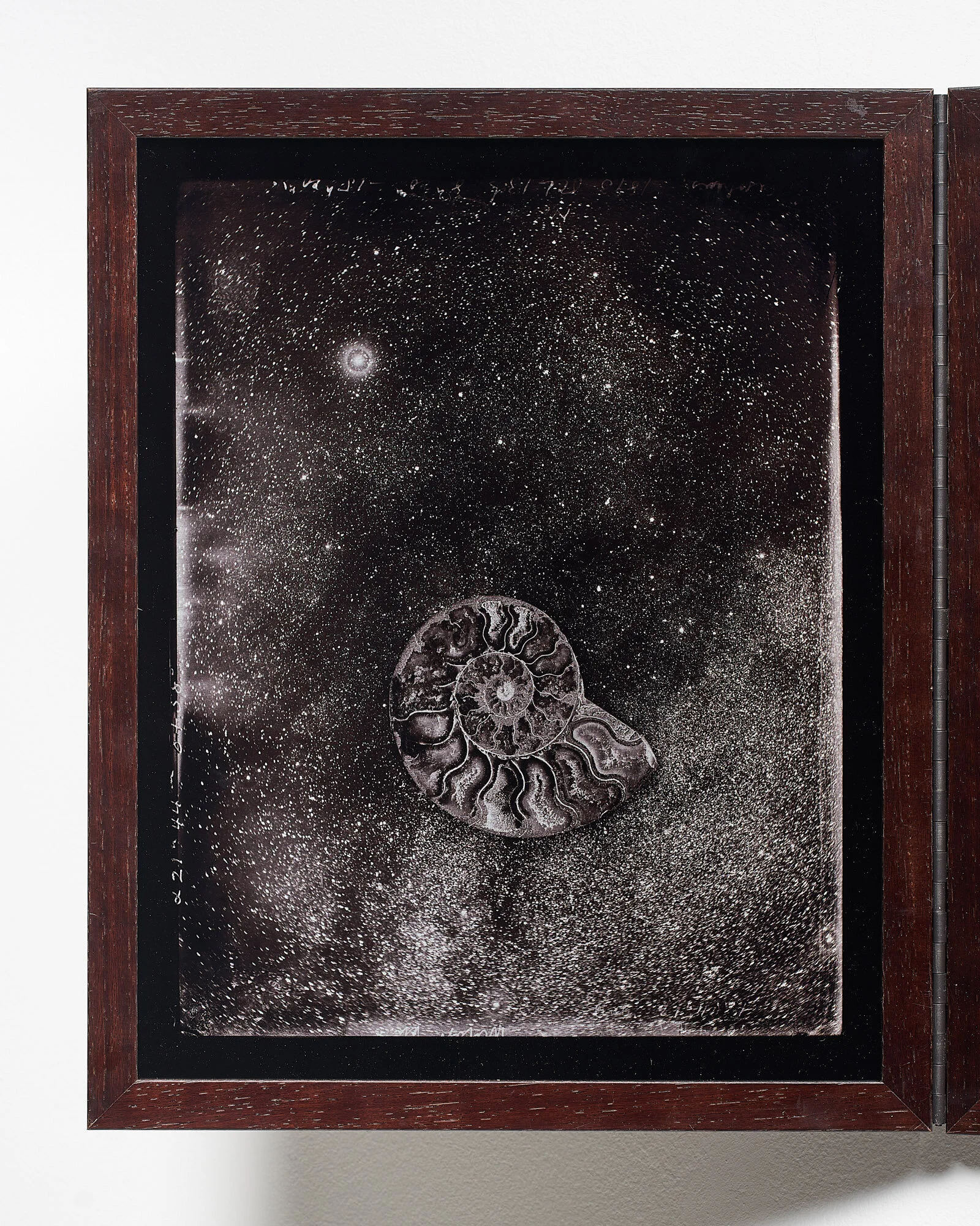 This artwork brings together a number of approaches and content that I have used during my career, as well as reflecting on the concept of the Ark. In the late 1990s, I was able to access the Lick Observatory Archive of astronomical photographic glass plate negatives, many dating back to the late 1800s. I was able to make sun exposed contact prints (some of them from broken plates reassembled for the printing). For this piece, I had sublimated prints on aluminum made to further reveal the luminosity of the night sky. The piece is designed as a triptych and can be hung on a wall or freestanding. Framed in a dark wood finish, the two hinged outer panels can fold inward. Through digital layering, I collaged an Ammonite into our Milky Way, “a sea of stars” suggesting our planet Earth and our interconnected web of life. The right-hand panel shows a section of sky from a fractured glass plate negative, with a Zephyr blowing turbulence from the corner of the image. This piece is about where we are in the largest context, in time and space and a warning of the fragility of our Earth Ark.