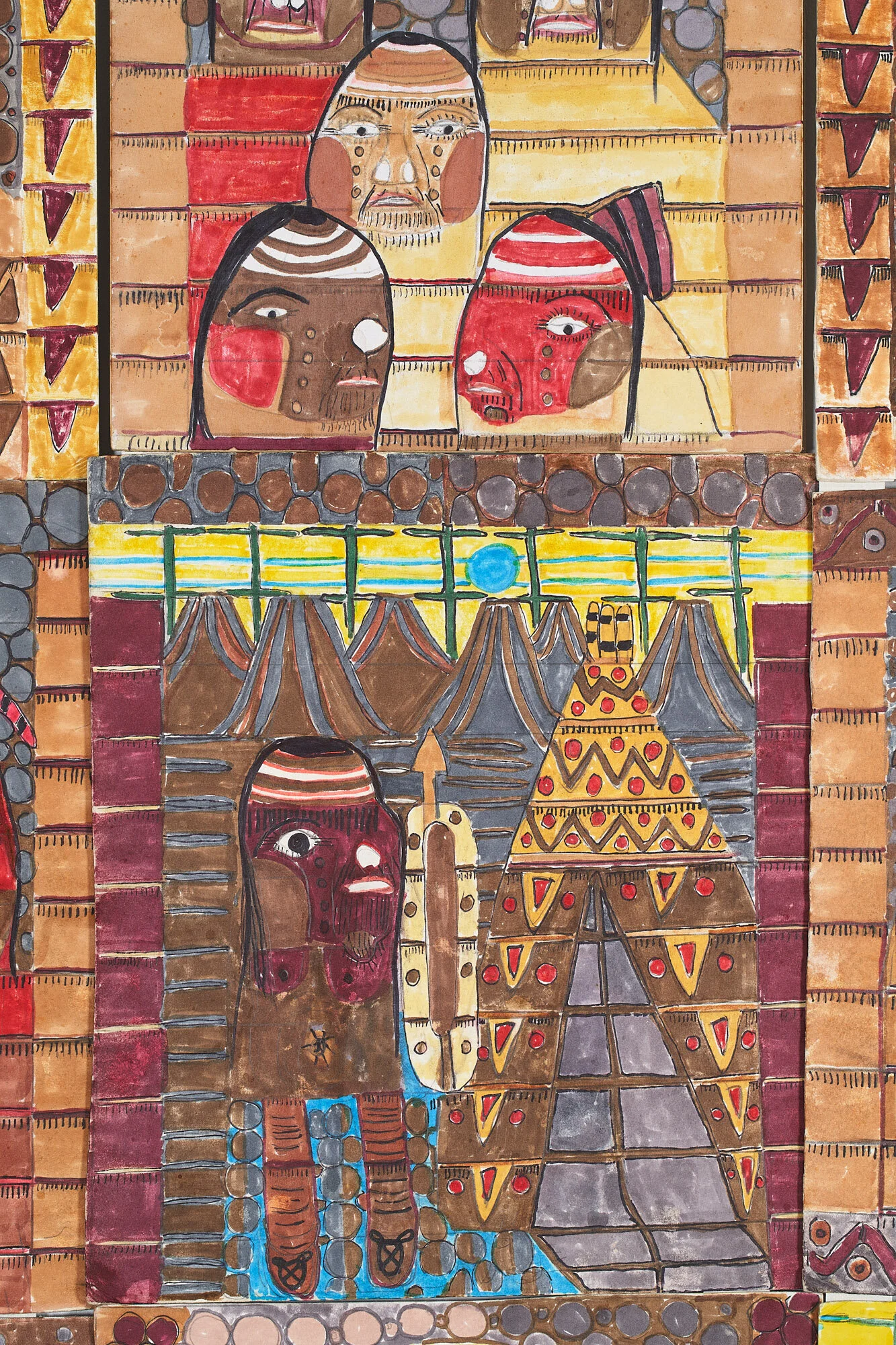 ARTIST BIO:Peter Cordova references memories of his birthplace in the Philippines and his interest in Indigenous American cultures in his practice. His detailed depictions of cultural activities and stylized figures are illuminated by his application of rich and earthy palettes. In his ceramic practice, Cordova excels in hand-building techniques, emphasizing the naturalism of clay with his unique aesthetic. Carefully incised marks adorning his clay forms echo the precise qualities found in his drawings. Cordova has been working as an artist at Creativity Explored since 1996.